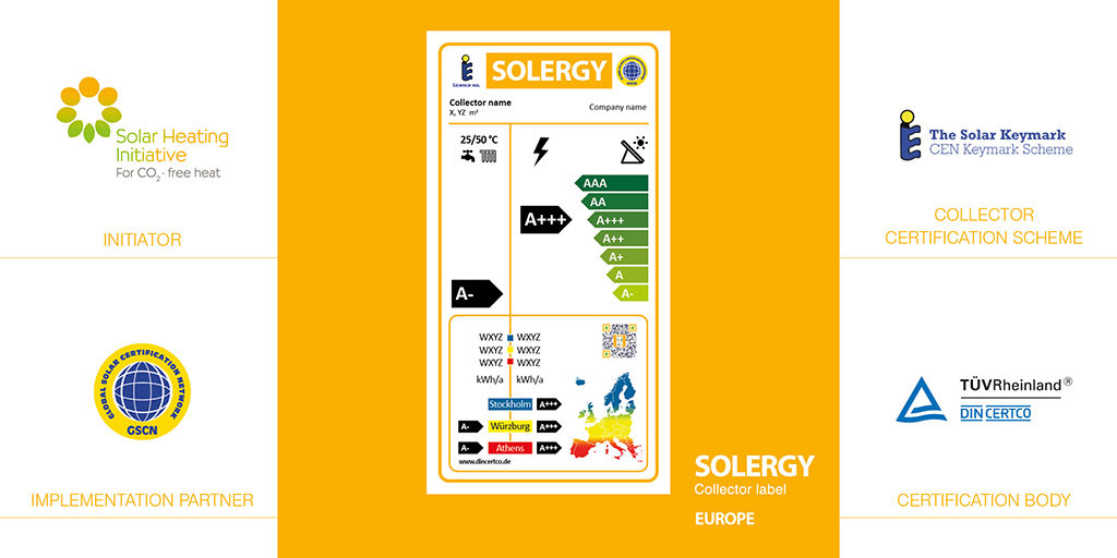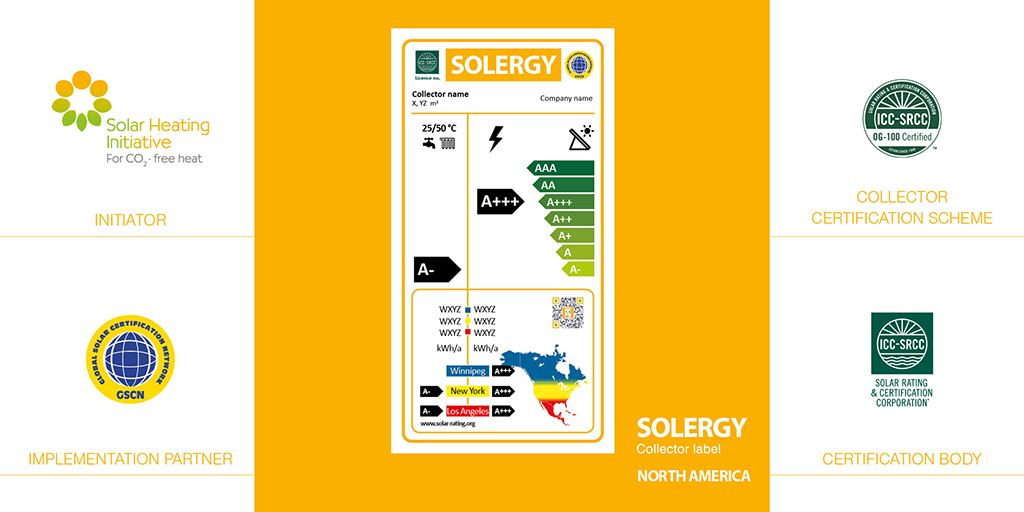 The innovative and consumer friendly SOLERGY label has been available for locations in the EU since 2016. The design originated with the European Energy Label (ErP), which provides easy-to-read information the energy consumption of many devices in the EU. DIN CERTCO and the Solar Heating Initiative (SHI) recognized the need for such a label for solar thermal collectors producing energy onsite. The new label added A- to AAA performance ratings showing the energy production capacity for different regions in the EU and different applications. A prerequisite for obtaining the SOLERGY label is that the collector already holds a valid certification—either the European Solar KEYMARK certificate or the OG-100 certification issued by ICC-SRCC in the United States.